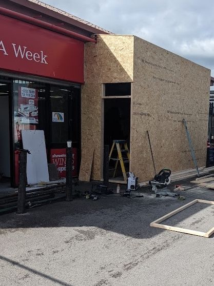 Following an attempted robbery by ram raiding the shop front we secured the premises out of hours. A full security hoarding and fencing was erected to secure the premises and also enclose the work area from the busy public car park. Structural propping was carried out to ensure the building and demolition area was safe to work. The brick and block perimeter wall was toothed out and matching bricks sourced. The steel support column was manufactured and reinstalled and then the brick and block work completed to restore the shop facade. The shop did not loose a day of trading.